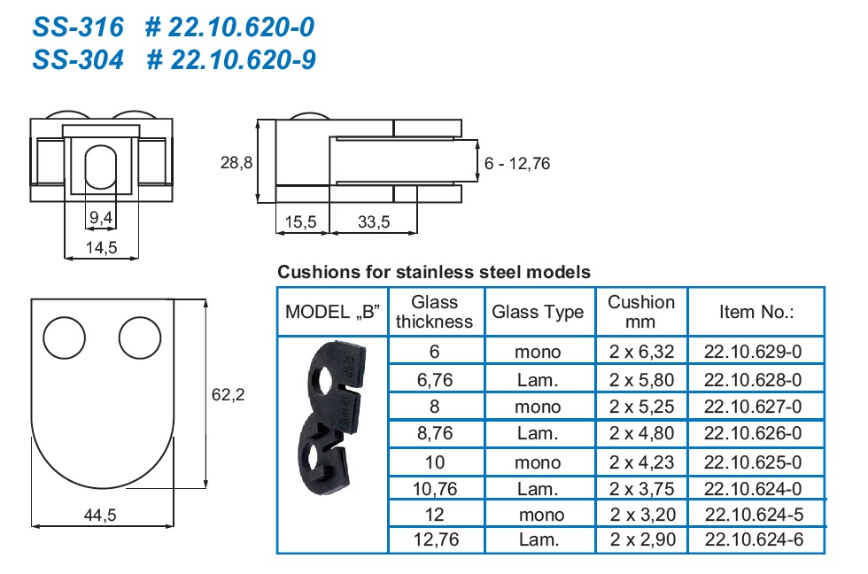 Glass Clamp "Oval-L" 45x63x29mm, SS304-Brushed, Flat, 6-12,76mm Glass Thickness, No Safety Pin & No Cushions (Cushion Model B) Max Load Capacity Pr.Pcs: 25Kg
