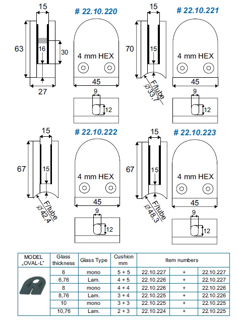 Glass Clamp "Oval-L" 45x67x27mm, Zamak-Raw, ø42,4mm Tube, 6-10,76mm Glass Thickness,No Safety Pin & No Cushions