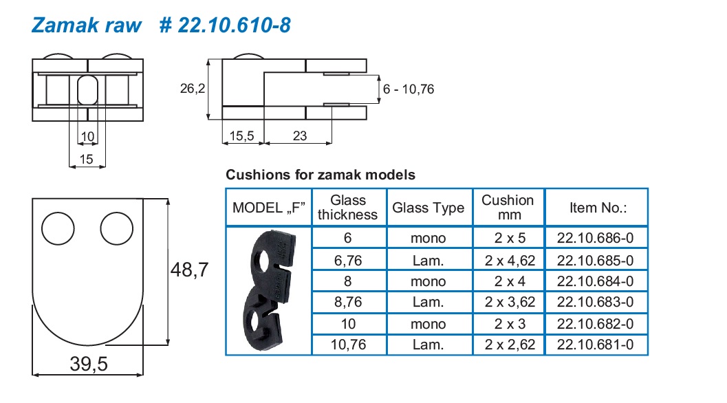 Glass Clamp "Oval-S" 39,5x49x26mm, Zamak-Raw, Flat, 6-10,76 mm Glass Thickness, No Safety Pin & No Cushions (Cushion Model F)