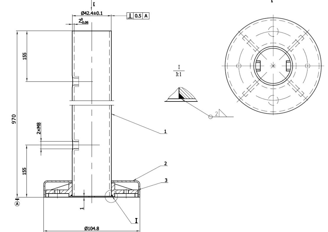 End Baluster SS316 Brushed,ø42,4x2x970mm, 2 Holes One Side
