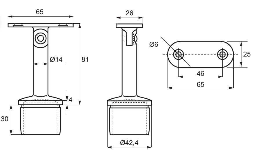 Flat Flexible Rail Support, SS304-Brushed, ø42,4x2,0x 81mm
