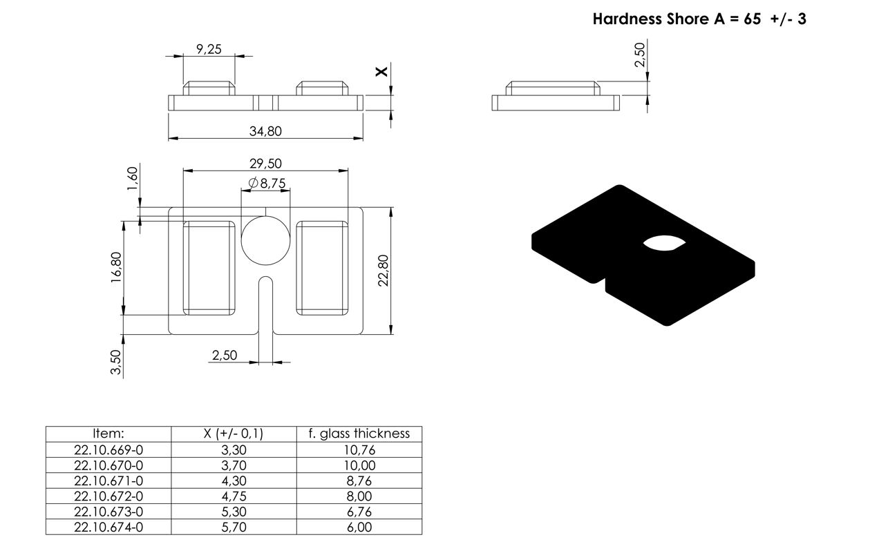 Cushion "C" F/SS Clamp "Square BT", Glass 10mm (3,70mm), Black EPDM