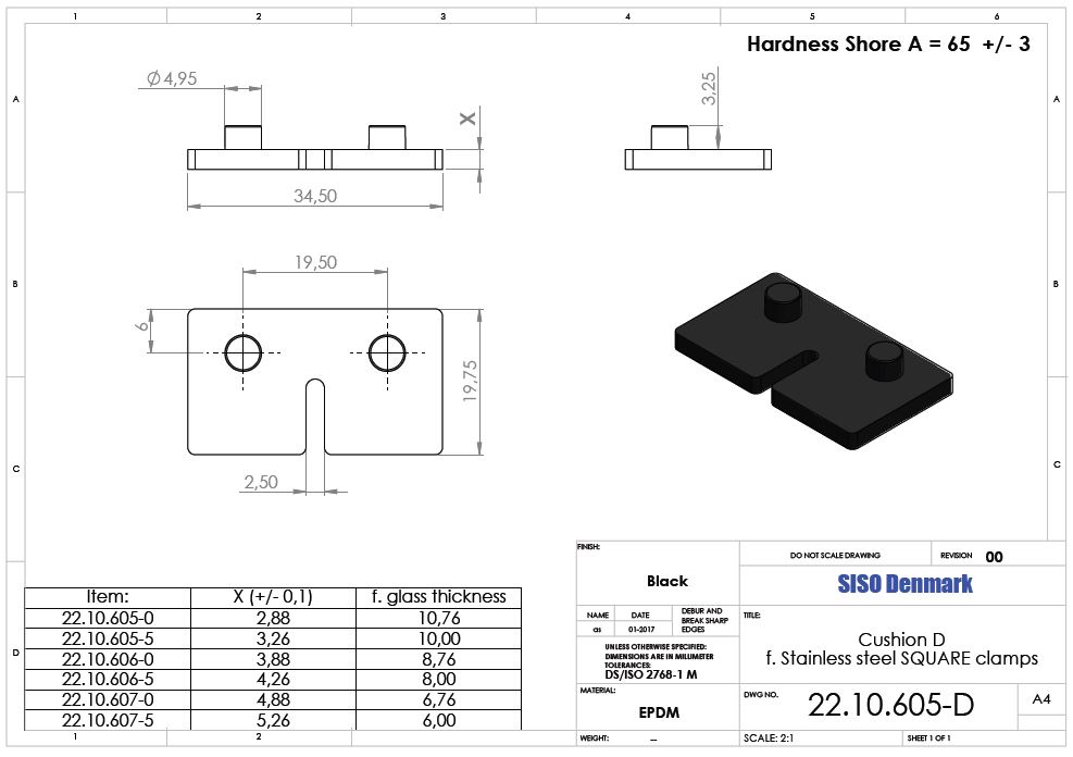 Cushion "D" F/SS Clamp "Square", Glass 6,76mm (4,88mm),Black EPDM
