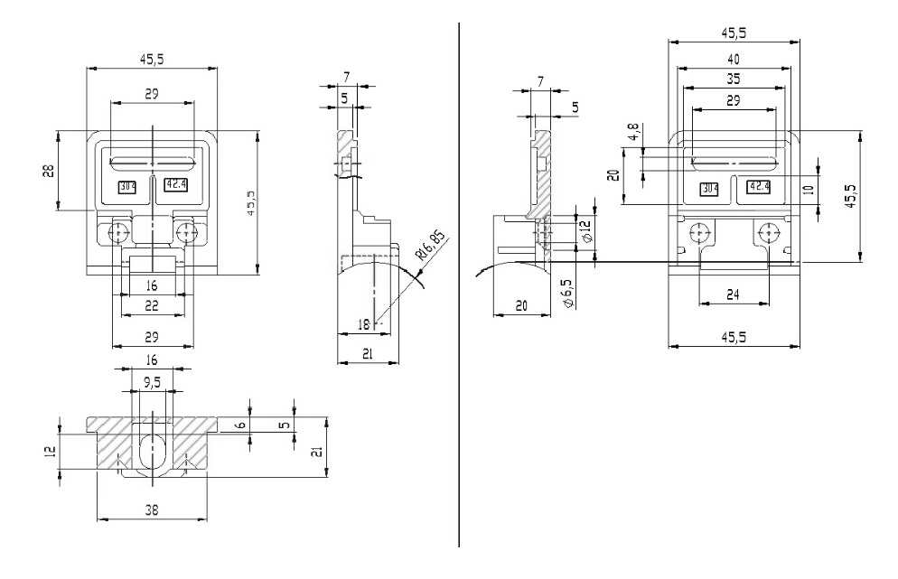 Glass Clamp "Square" 45x47x27mm, SS304-SSS, ø33,7mm Tube, 6-10,76mm Glass Thickness,No Safety Pin & No Cushions (Cushion Model D) Max Load Capacity Pr.Pcs: 25Kg