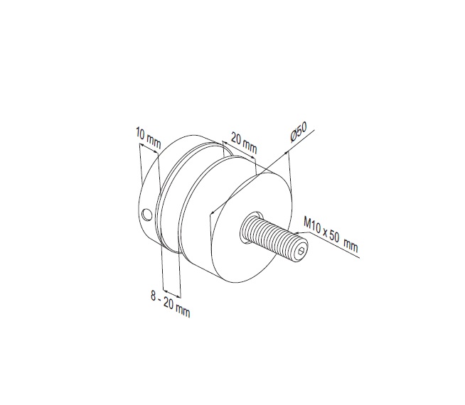Adjustable Stand-Off Glass Adapter,SS316,Brushed,ø50x20mm,F/ 8-20mm. Glass, W/M10x50mm Threaded Rod, Drill Hole ø14mm