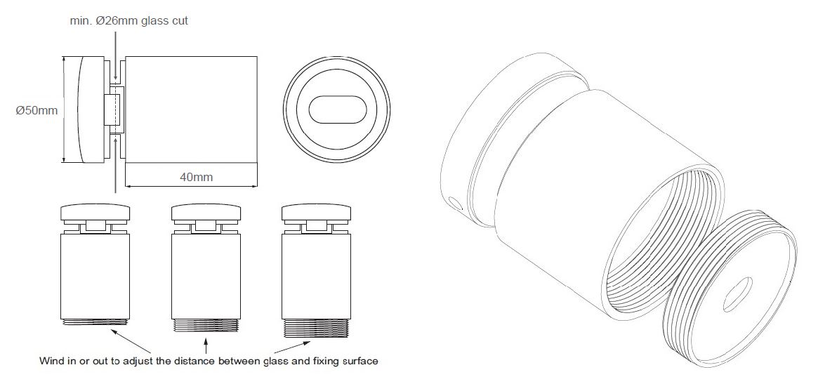 Adjustable Stand-Off Glass Holder,SS316,Brushed,ø50x40mm, F/ 6,76-17,5mm. Glass, W/M10x40mm Threaded Rod