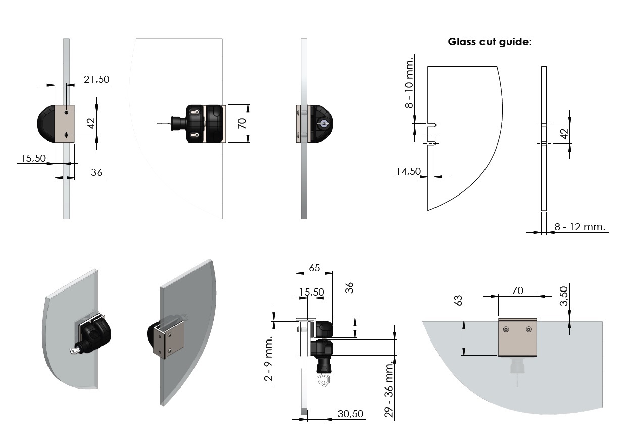 Baluster Latch Lock SS316, W/Key, Wall/Glass 8-12mm Glass, Brushed