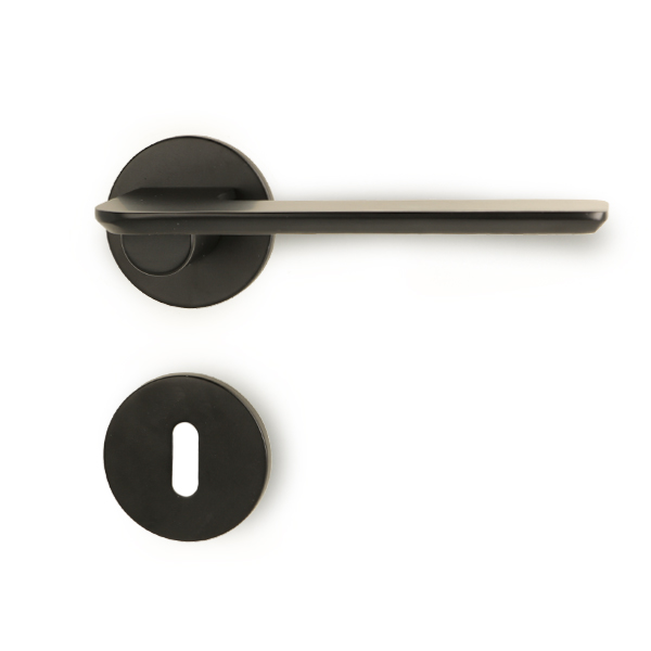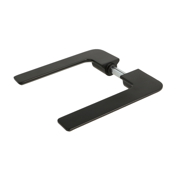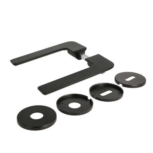 Zamak Door Handle "Disco", Black Finish, 8x8x95mm Split Spindle, Incl. Round Spring Rosettes, Oval Key Hole Escutcheons, Hex Key, Wooden Screws, M4 Connecting Screws & Washers. cc: 38mm. Door Thickness: 38-50mm.