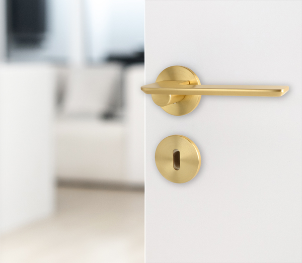 Zamak Door Handle "Disco", Brushed Brass, 8x8x95mm Split Spindle, Incl. Round Spring Rosettes, Oval Key Hole Escutcheons, Hex Key, Wooden Screws, M4 Connecting Screws & Washers. cc: 38mm. Door Thickness: 38-50mm.