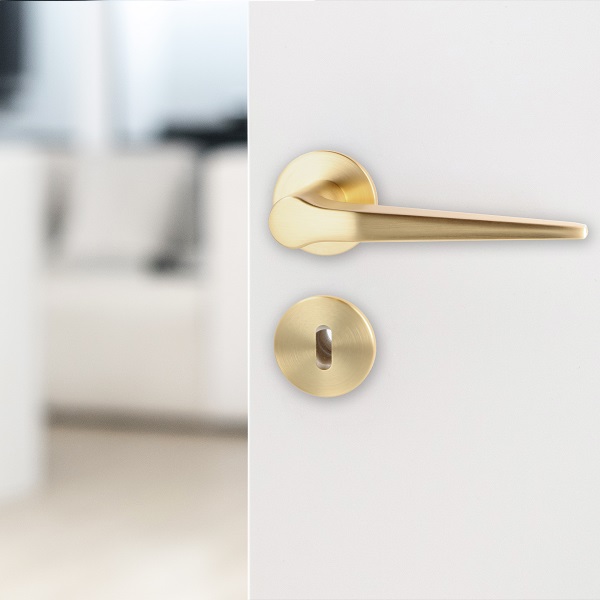 Zamak Door Handle "Funk", Brushed Brass, 8x8x95mm Split Spindle, Incl. Round Spring Rosettes, Oval Key Hole Escutcheons, Hex Key, Wooden Screws, M4 Connecting Screws & Washers. cc: 38mm. Door Thickness: 38-50mm.