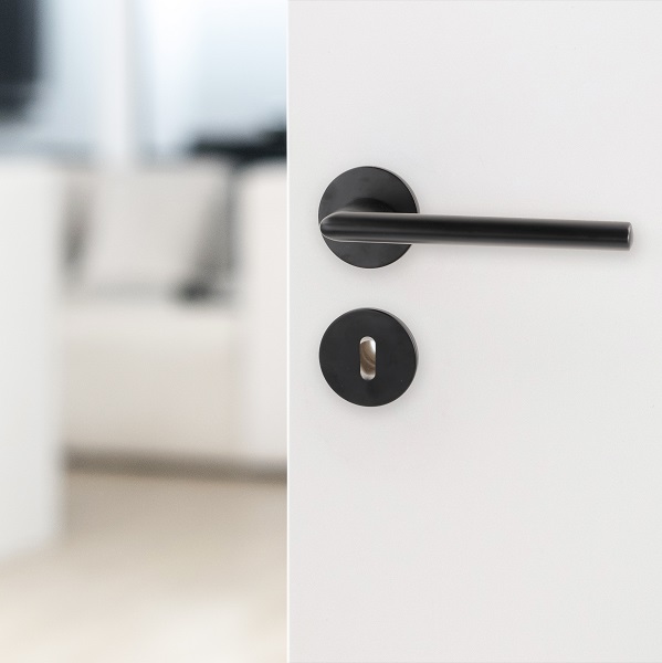 Zamak Door Handle "Jazz", Black Finish, 8x8x95mm Split Spindle, Incl. Round Spring Rosettes, Oval Key Hole Escutcheons, Hex Key, Wooden Screws, M4 Connecting Screws & Washers. cc: 38mm. Door Thickness: 38-50mm.