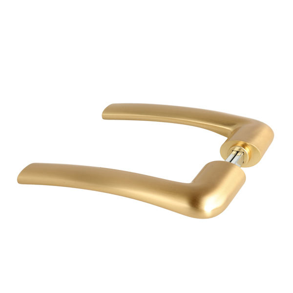 Zamak Door Handle "Trance", Brushed Brass, 8x8x95mm Split Spindle, Incl. Round Spring Rosettes, Oval Key Hole Escutcheons, Hex Key, Wooden Screws, M4 Connecting Screws & Washers. cc: 38mm. Door Thickness: 38-50mm.