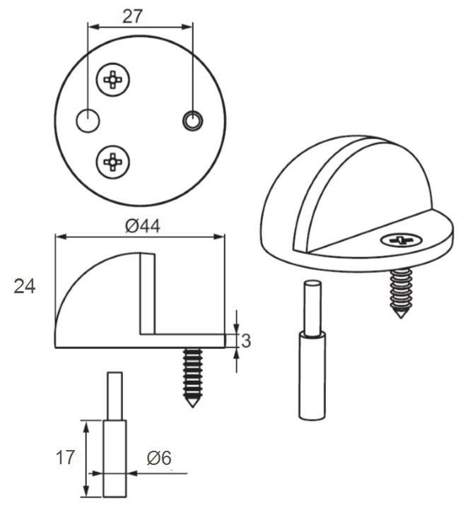 Door Stopper "Half-Moon", ø44mm, SS304 Brushed, Incl. 1 SS-304 Screw ø4x30mm & Matching Floor Plug +SS304 Fixing Pin ø6x20mm