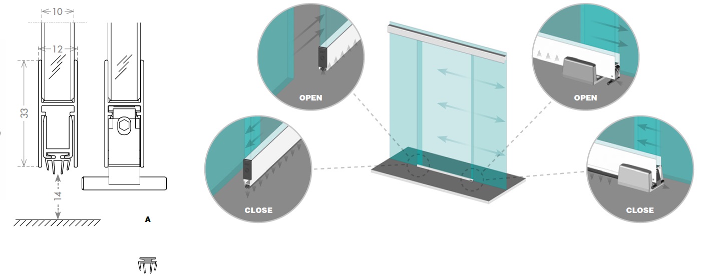 Sliding Door Drop Down Alu Profile,"A" ,F/10mm Glass,1030mm, W/Adhesive Tape, Anodized finish, 4 Fins Thermoplastic Seal (A)