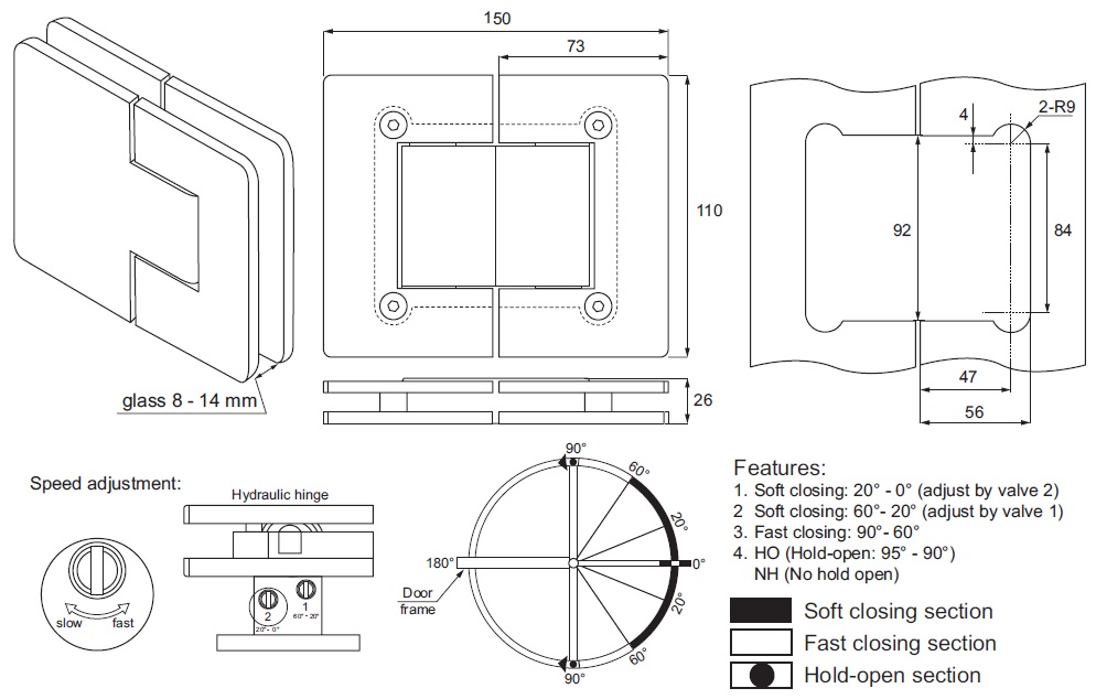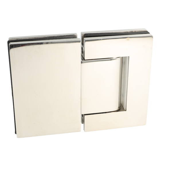 Soft Close Hinge "Klap II", Glass/Glass,SS-304, Polished,8- 14mm, Back Plate, Polished, Max Door Weight: 60KG, Max Door Height 2400mm, Max Door Width: 1000mm, Self-Closing at 85DG, Hold-Open at 90DG, Max Door Angle 95DG. Tested According to EN1154