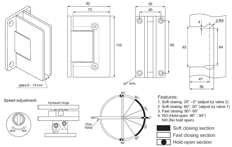 Soft Close Hinge "Klap II", Wall/Glass, SS316, Brushed,8-14 mm, Back Plate, Brushed, Max Door Weight: 60KG, Max Door Height 2400mm, Max Door Width: 1000mm, Self-Closing at 85DG, Hold-Open at 90DG, Max Door Angle 95DG. Tested According to EN1154