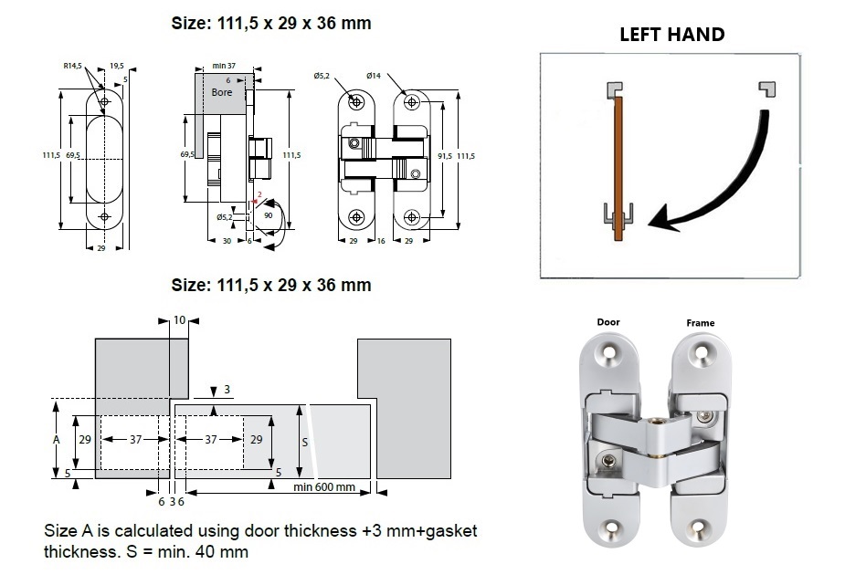 Vici Hinge 3-D Left Hand, 111,5x29x36mm Zamak, Alu-Look, 180DG Opening, Max Door Size:1000x2700mm, Max Weight:60 KG Min Door Thinckness:40mm, Vertical,Horizontal & In//Out- Wards Adjustment without Removing The Door