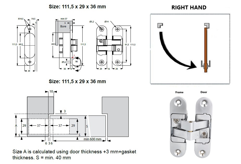 Vici Hinge 3-D Right Hand, 111,5x29x36mm Zamak, Alu-Look, 180DG Opening, Max Door Size:1000x2700mm, Max Weight:60 KG Min Door Thinckness:40mm, Vertical,Horizontal & In//Out- Wards Adjustment without Removing The Door