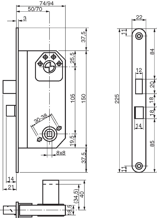 Mortise Door Lock 565, Right, 50mm Backset, W/Striker, Latch & Deadbolt 90DG Turn, Lock Body: 150x75mm, Front Plate 22x225mm - SS-Look, Distance Between Axes: 105mm, For Scandinavian Cylinders, F/Exterior & Interior Doors