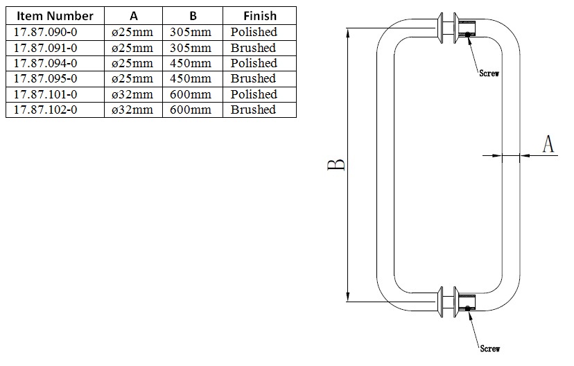 Door Handle "Main" SS304 Brushed, ø25x330mm, cc 305mm, 8-12mm Glass Thickness, Bore: ø12mm