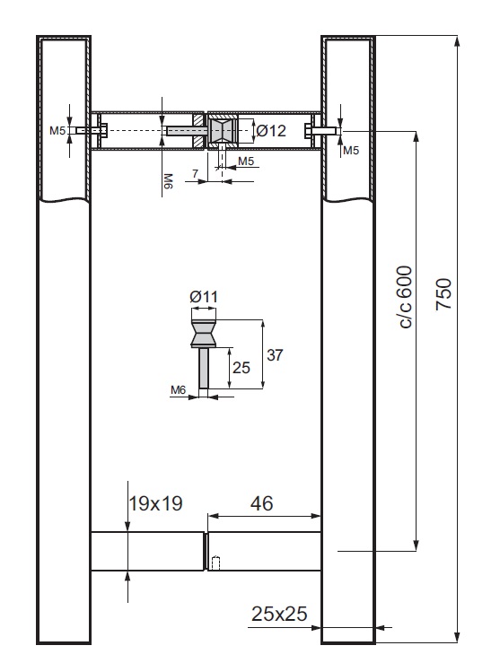 Door Handle "Sava" SS304 Polished, 25x25x750mm, cc 600mm, 8-12mm Glass Thickness, Bore: ø12mm