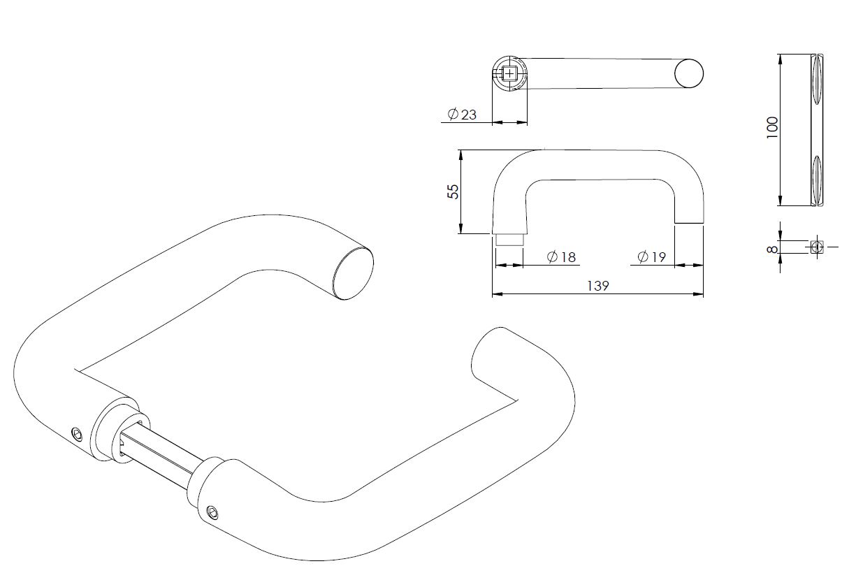 Door Lock Handle "Wes II", Alu-Look, 8x8x100mm Split Spindle