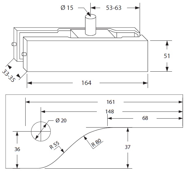 Overpanel Fitting "Zip"(PF30)51x164x35mm,SS304-PSS Cover, Alu Body, 10-12mm Glass Thickness, C.E: 55-63mm, ø15mm Drum Spindle