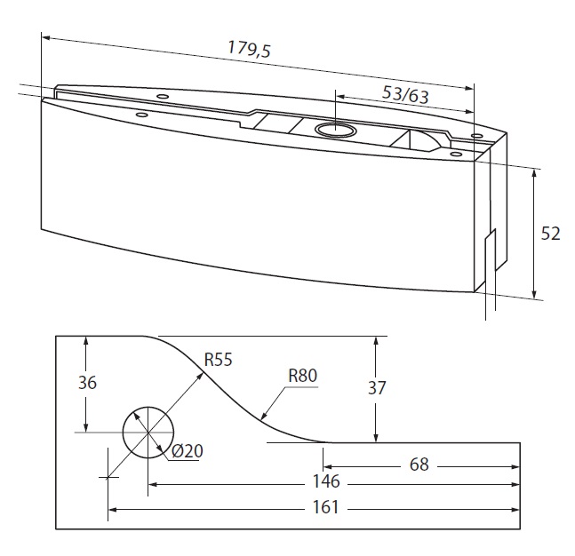 Top Fitting "Lex" 52x179,5mm,Brushed SS-304 Cover,10-12mm Glass, w/2pcs. 1mm & 2 pcs. 2mm Gaskets(Not Glued)