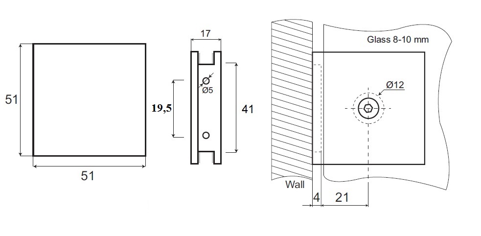 Glass Clamp "Bern", 180DG, Alu-Look, Wall/Glass, 51x51x17mm, Square Corners, F/8-10mm Glass,Wall Mounted By 2 x ø5mm Screw Holes,Glass Mounted By ø12mm Drilling, Brass Material