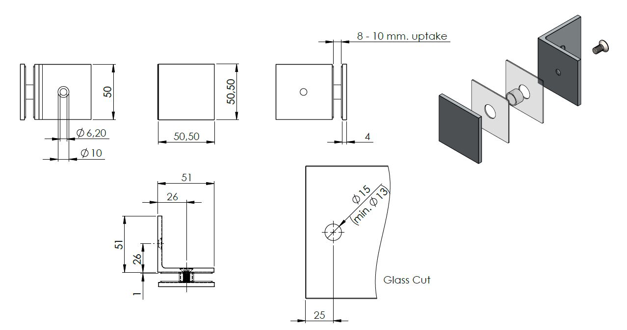 Glass Clamp "Bern", 90DG, Brushed Brass, Glass/Wall, 51x51x 17mm Square Corners, 8-10mm Glass, Wall Mounted By ø5mm Screw Hole, GLass Mounted By ø12mm Drilling, Brass Material