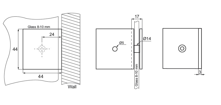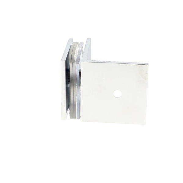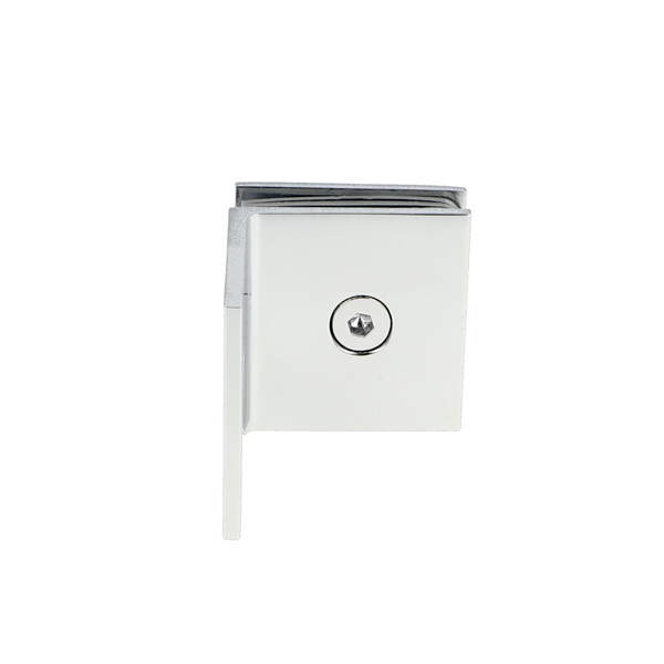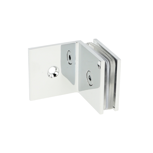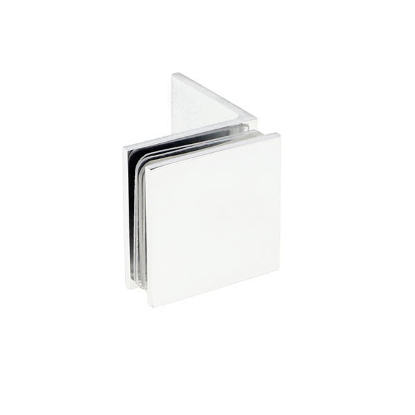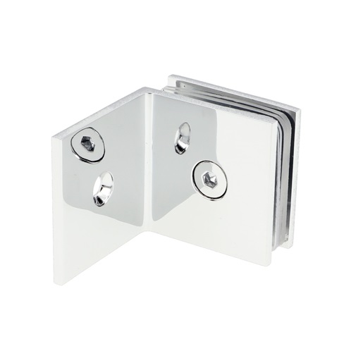 Glass Clamp "Berni", 90DG, CPL, Glass/Wall, 44x44x17mm, Square Corners, 8-10mm Glass, Wall Mounted By ø5mm Screw Hole, GLass Mounted By ø12mm Drilling, Brass Material