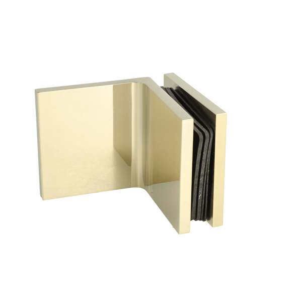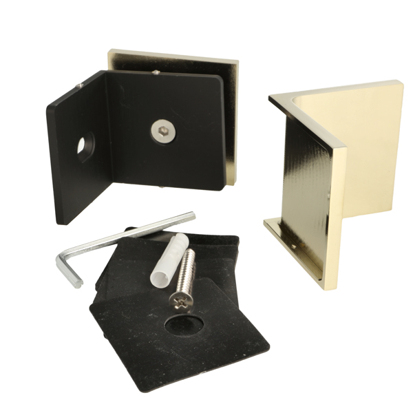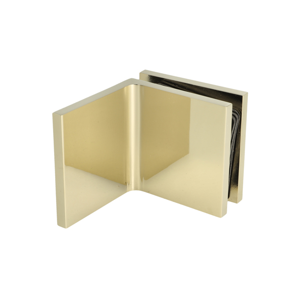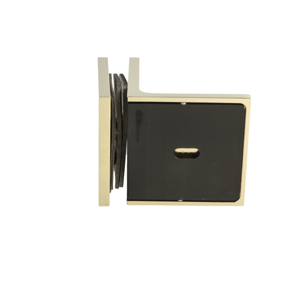 Glass Clamp "Lima", 90DG, Polished Brass, Glass/Wall, 60x60x 20,5mm, 6-10mm Glass, Wall Mounted By ø5mm Screw Hole, Glass Mounted By ø14mm Drilling, Hidden Screws, Brass, Alu & SS-304 Material
