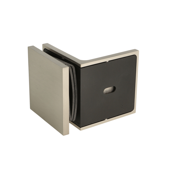 Glass Clamp "Lima", 90DG, SS-Look, Glass/Wall, 60x60x20,5mm, 6-10mm Glass, Wall Mounted By ø5mm Screw Hole, Glass Mounted By ø14mm Drilling, Hidden Screws, Brass, Alu & SS-304 Material