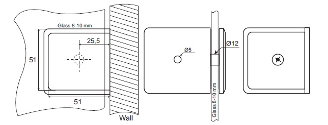 Glass Clamp "Lund", 90DG, Alu-Look, Wall/Glass, 51x51x17mm, 8-10mm Glass, Wall Mounted By 1xø5mm Screw Hole, Glass Mounted By ø12mm Drilling, Brass Material, Chamfered Edges
