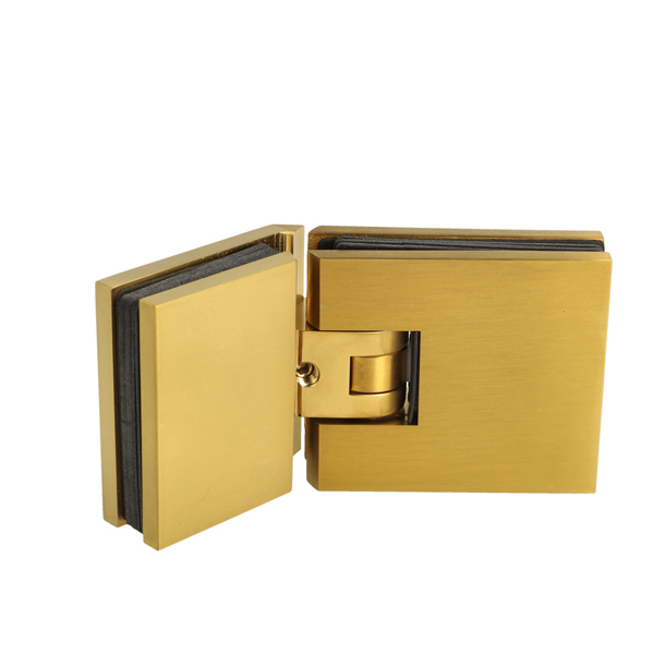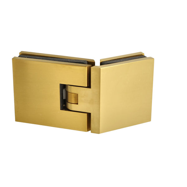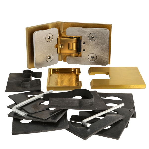 Shower Hinge "Lima", 135DG, Brushed Brass, Glass/Glass, 6-10 mm Glass Thickness, W/15 DG Angle Adjustment Function & 15DG Return Function, Brass Material, Hidden Screws. Black Rubber Gaskets: 4 x 1mm & 4 x 2mm Thickness. Load Capacity Pr. Pair: 45kg