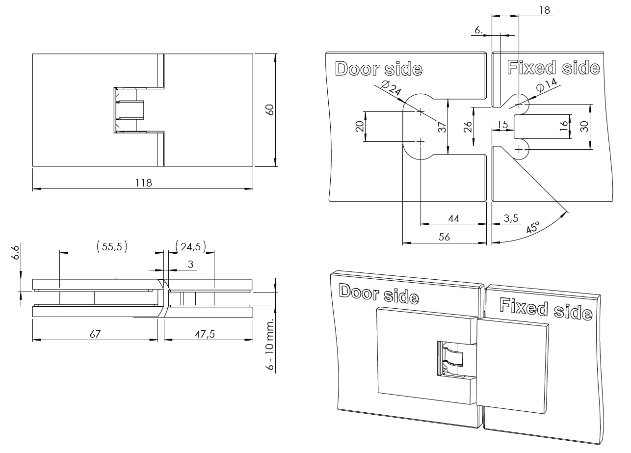 Shower Hinge "Lima", 180DG, Glass/Glass, CPL, 6-10mm Glass Thickness, W/15 DG Angle Adjustment Function & 15DG Return Function, Brass Material, Hidden Screws. Black Rubber Gaskets: 4 x 1mm & 4 x 2mm Thickness. Load Capacity Pr. Pair: 45kg