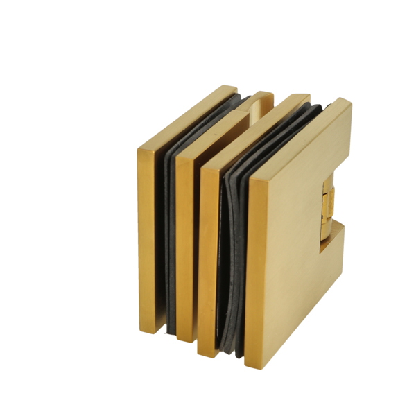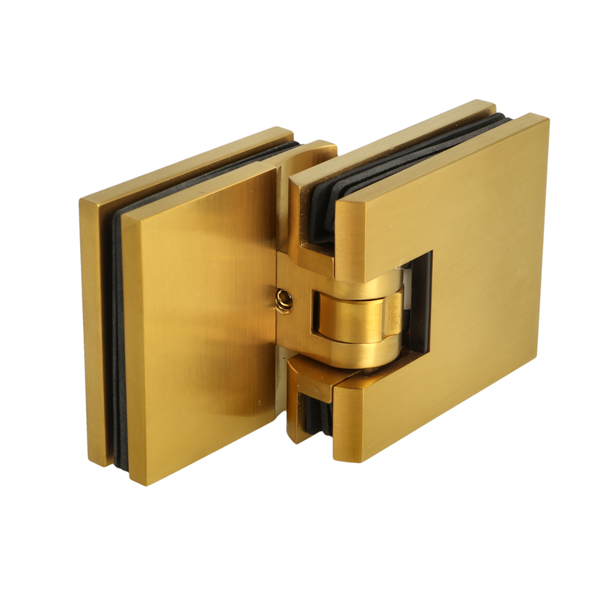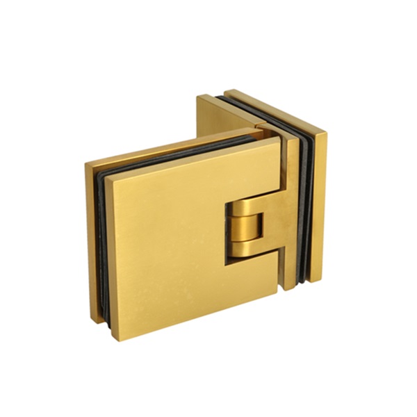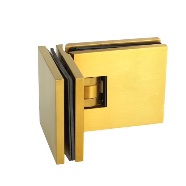 Shower Hinge "Lima", 90DG, Glass/Glass, Brushed Brass, 6-10 mm Glass Thickness, W/15 DG Angle Adjustment Function & 15DG Return Function, Brass Material, Hidden Screws. Black Rubber Gaskets: 4 x 1mm & 4 x 2mm Thickness. Load Capacity Pr. Pair: 45kg
