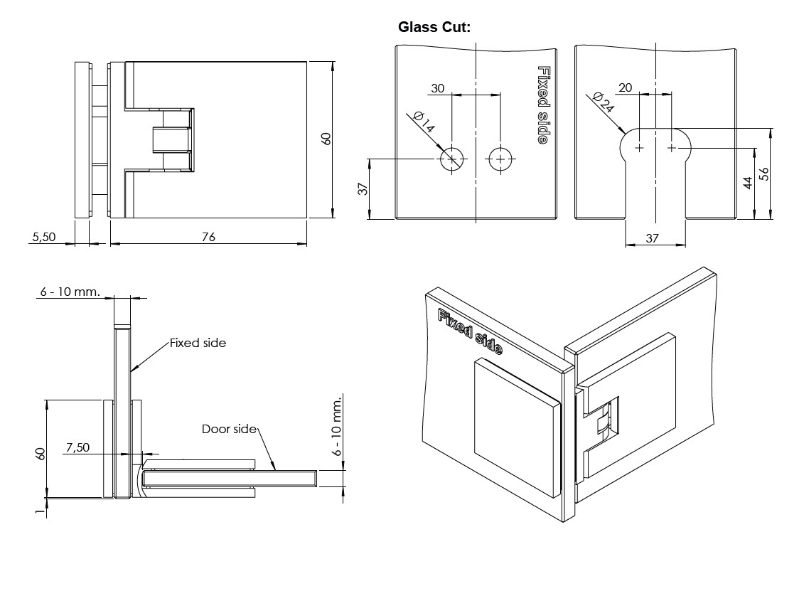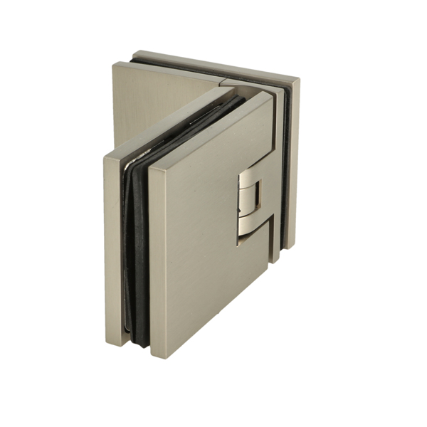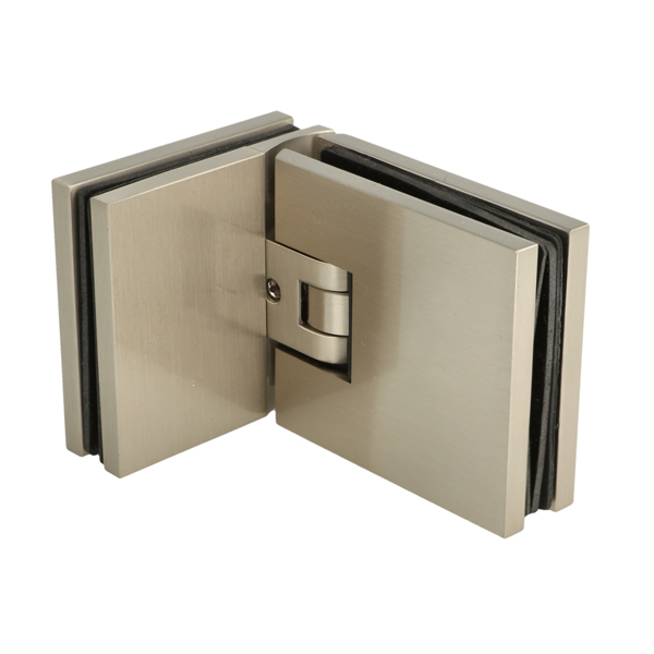 Shower Hinge "Lima", 90DG, Glass/Glass, SS-Look,6-10mm Glass Thickness, W/15 DG Angle Adjustment Function & 15DG Return Function, Brass Material, Hidden Screws. Black Rubber Gaskets: 4 x 1mm & 4 x 2mm Thickness. Load Capacity Pr. Pair: 45kg