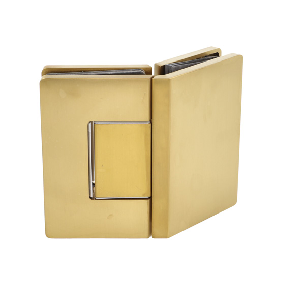 Shower Hinge "Rio", 135DG, Brushed Brass, Glass/Glass, 8-10 mm,Glass Thickness, W/15 DG Angle Adjustment Function & 15DG Return Function, Brass Material, Hidden Screws. Black Fiber Gaskets: 2 x 1mm & 2 x 2mm Thickness. Load Capacity Pr. Pair: 60kg, Max Door Widht: 1200mm.