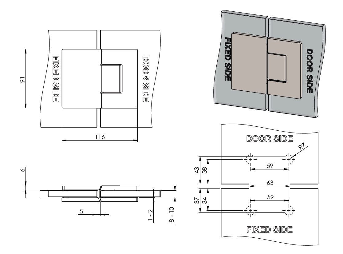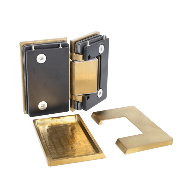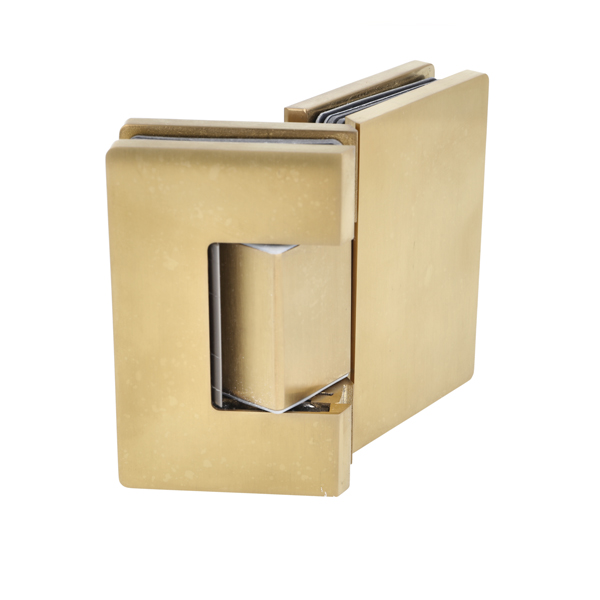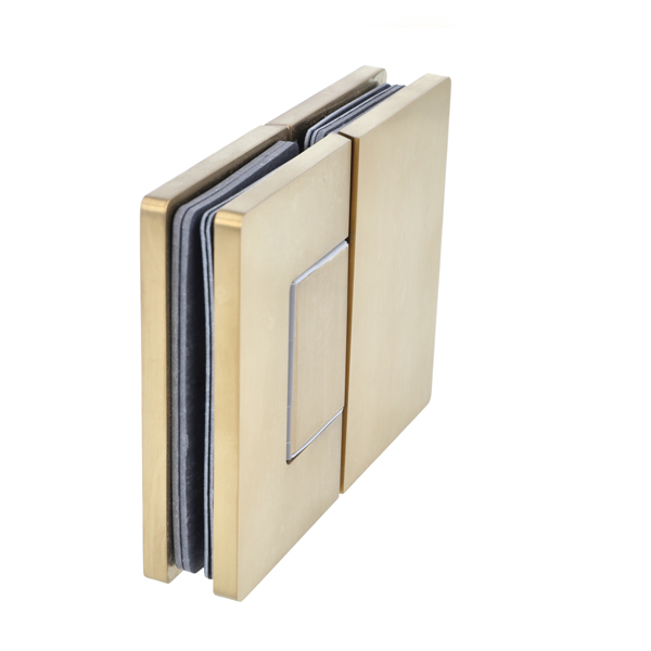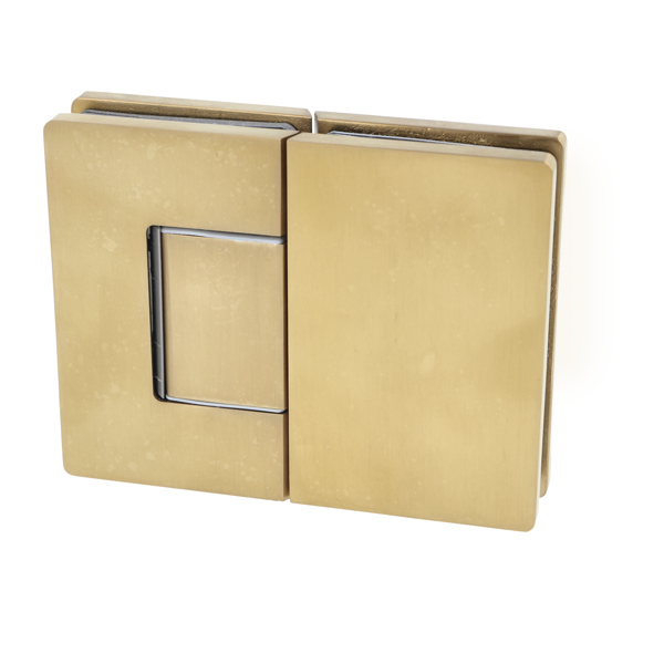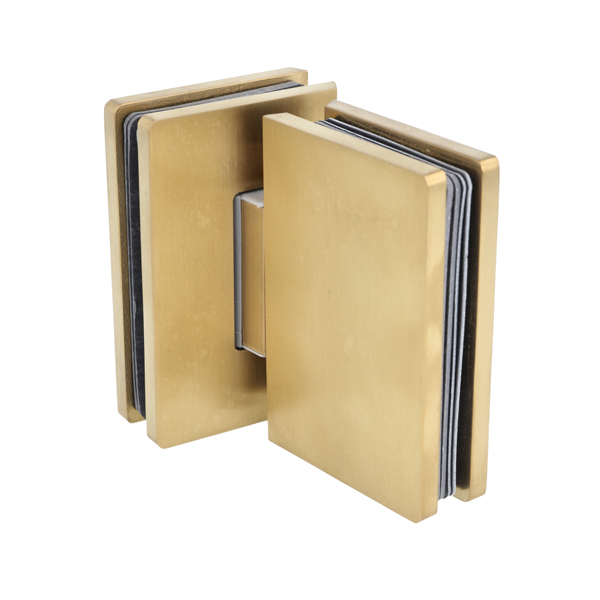 Shower Hinge "Rio", 180DG, Brushed Brass, Glass/Glass, 8-10 Glass Thickness, W/15DG Angle Adjustment Function & 15DG Return Function, Brass Material, Hidden Screws. Black Fiber Gaskets: 2 x 1mm & 2 x 2mm Thickness. Load Capacity Pr. Pair: 60kg, Max Door Widht: 1200mm.