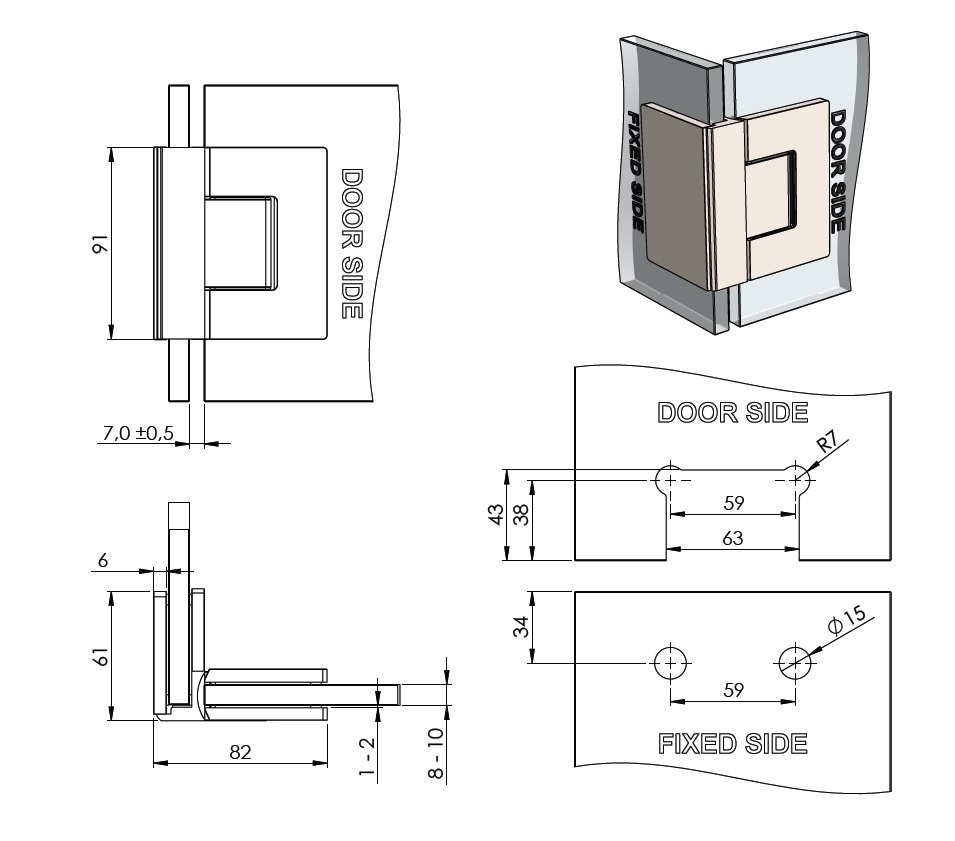 Shower Hinge "Rio", 90DG, Brushed Brass, Glass/Glass, 8-10 mm, Thickness, W/15DG Angle Adjustment Function & 15DG Return Function, Brass Material, Hidden Screws. Black Fiber Gaskets: 2 x 1mm & 2 x 2mm Thickness. Load Capacity Pr. Pair: 60kg, Max Door Widht: 1200mm.