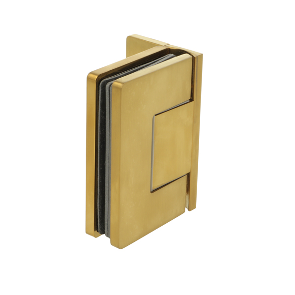 Shower Hinge "Rio", Wall/Glass, Brushed Brass, Offset Back , 8-10mm Glass Thickness, W/15 DG Angle Adjustment Function & 15DG Return Function, Brass Material, Hidden Screws. Black Fiber Gaskets: 2 x 1mm & 2 x 2mm Thickness. Load Capacity Pr. Pair: 60kg, Max Door Widht: 1200mm.