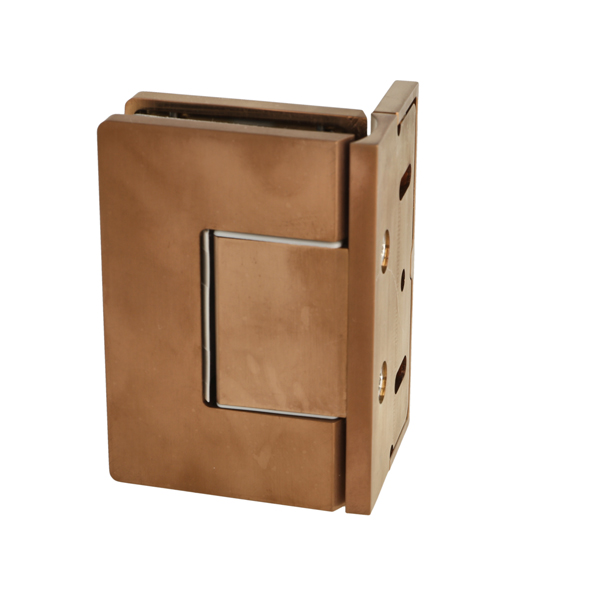 Shower Hinge "Rio", Wall/Glass, Brushed Copper, Offset Back , 8-10mm Glass Thickness, W/15 DG Angle Adjustment Function & 15DG Return Function, Brass Material, Hidden Screws. Black Fiber Gaskets: 2 x 1mm & 2 x 2mm Thickness. Load Capacity Pr. Pair: 60kg, Max Door Widht: 1200mm.