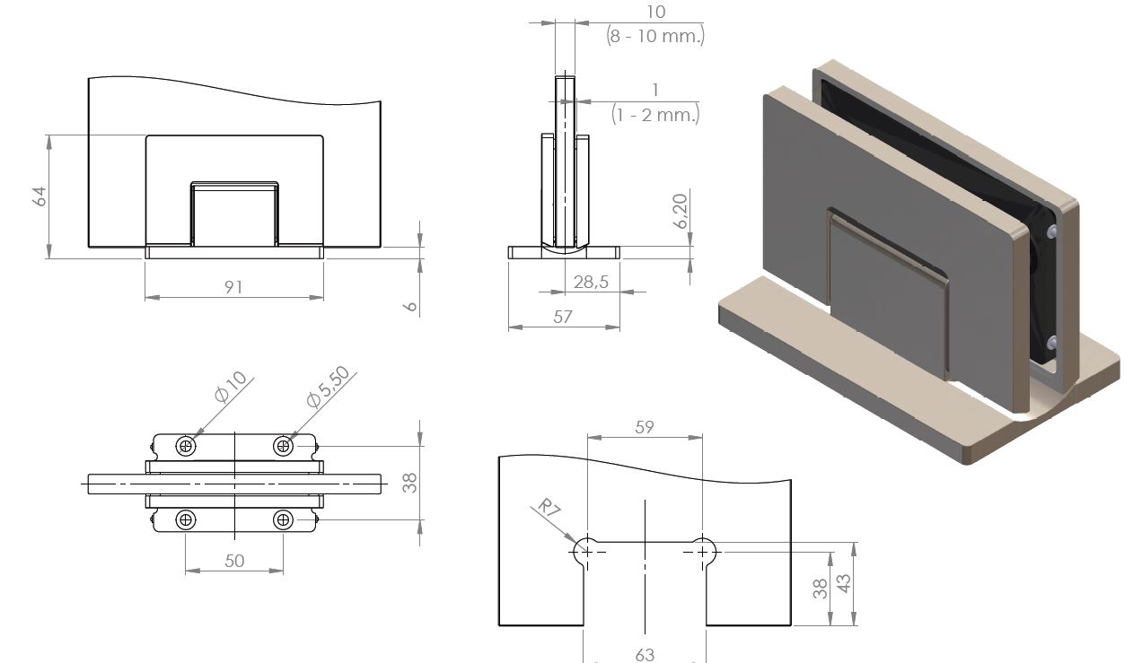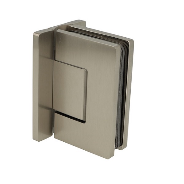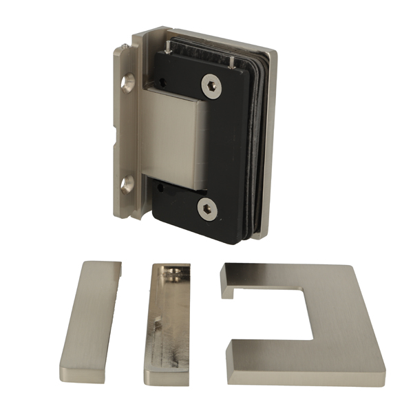 Shower Hinge "Rio", Wall/Glass, SS-Look, Centre Back Plate , 8-10mm Glass Thickness, W/15 DG Angle Adjustment Function & 15DG Return Function, Brass Material, Hidden Screws. Black Fiber Gaskets: 2 x 1mm & 2 x 2mm Thickness. Load Capacity Pr. Pair: 60kg, Max Door Widht: 1200mm.