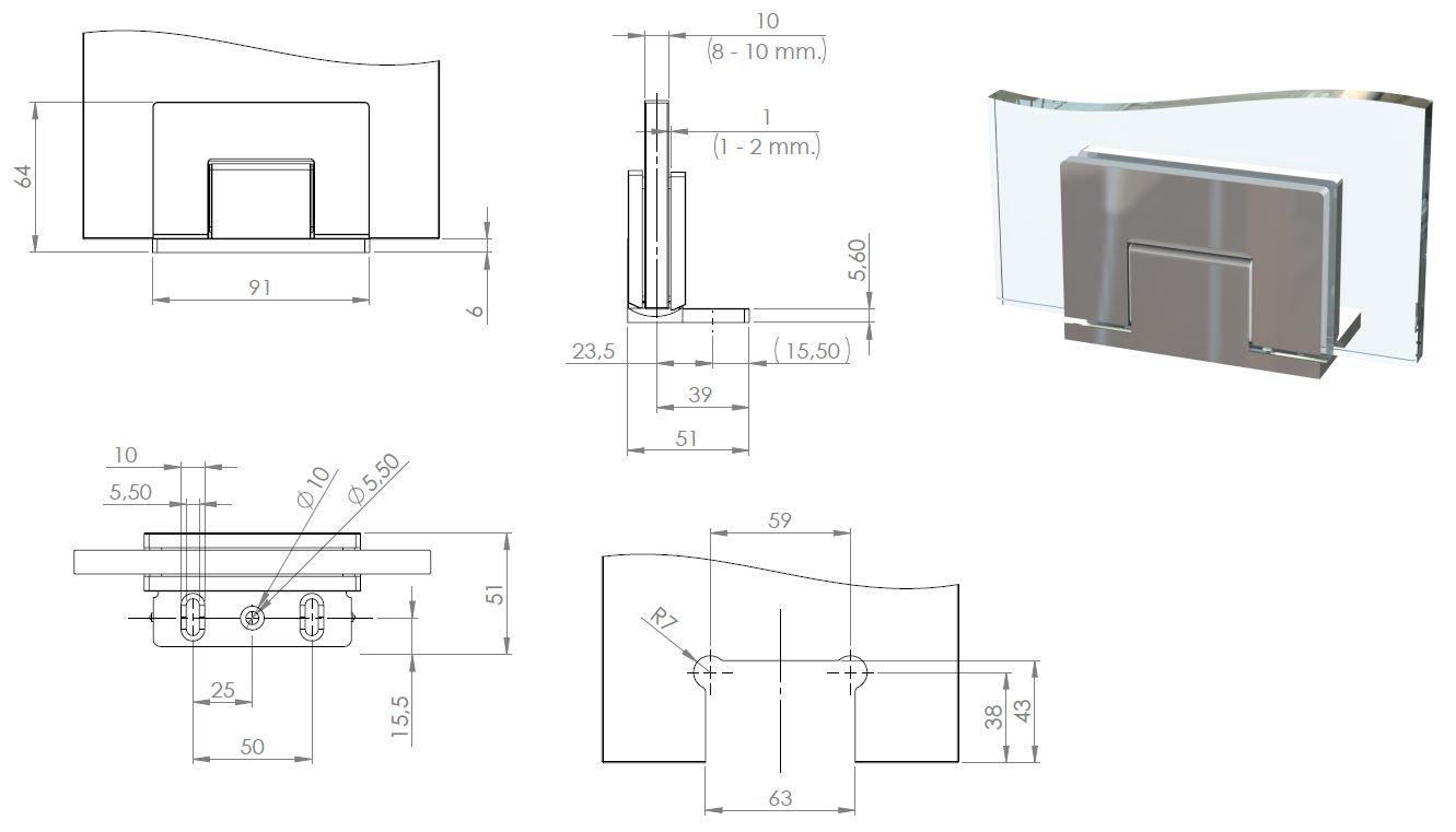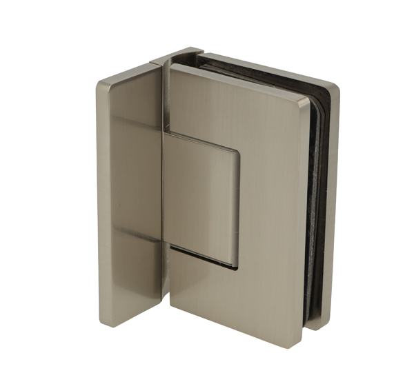 Shower Hinge "Rio", Wall/Glass, SS-Look, Offset Back Plate , 8-10mm Glass Thickness, W/15 DG Angle Adjustment Function & 15DG Return Function, Brass Material, Hidden Screws. Black Fiber Gaskets: 2 x 1mm & 2 x 2mm Thickness. Load Capacity Pr. Pair: 60kg, Max Door Widht: 1200mm.