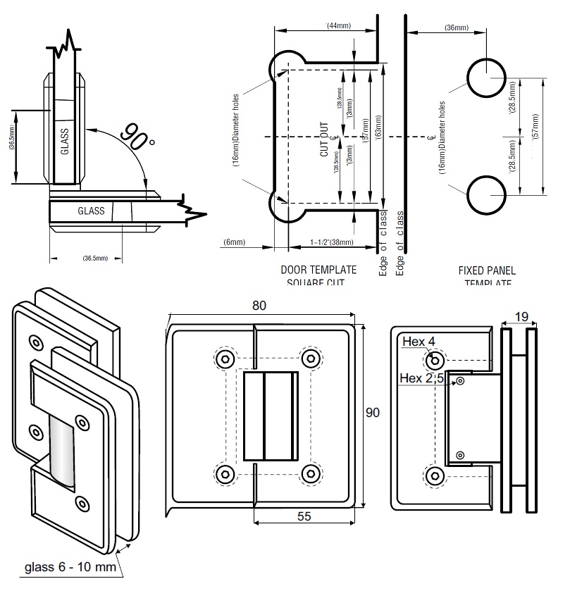 Shower Hinge "CPH", 90DG, Alu-Look, Glass/Glass,6-10mm Glass Thickness, W/Angle Adjustment Function & 25DG Return Function, Brass Material, Chamfered Edges