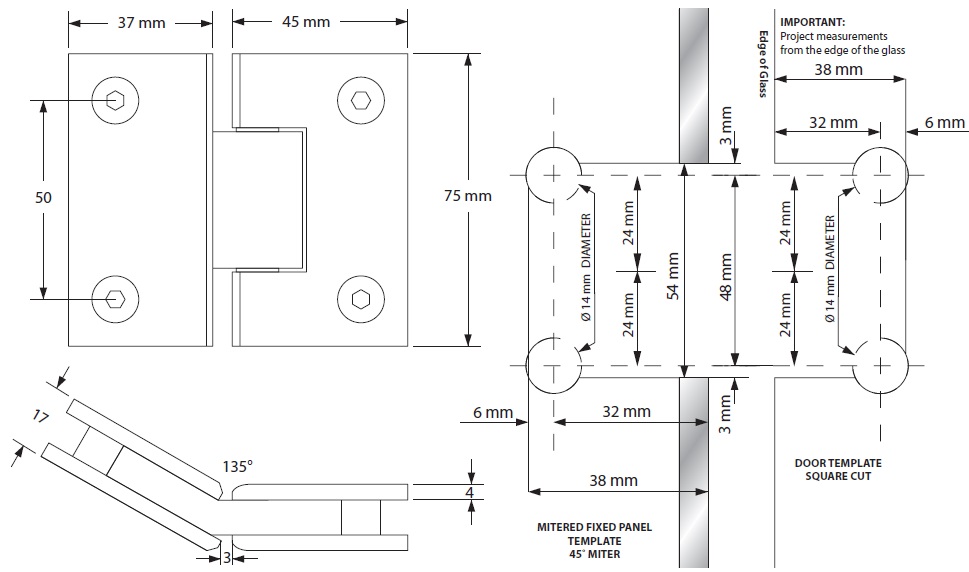 Shower Hinge "Jun" 135DG, CPL, Glass/Glass, 6-8mm Glass Thickness, No Angle Adjustment Function But 25 DG Return Function, Brass Material, Straight Edges