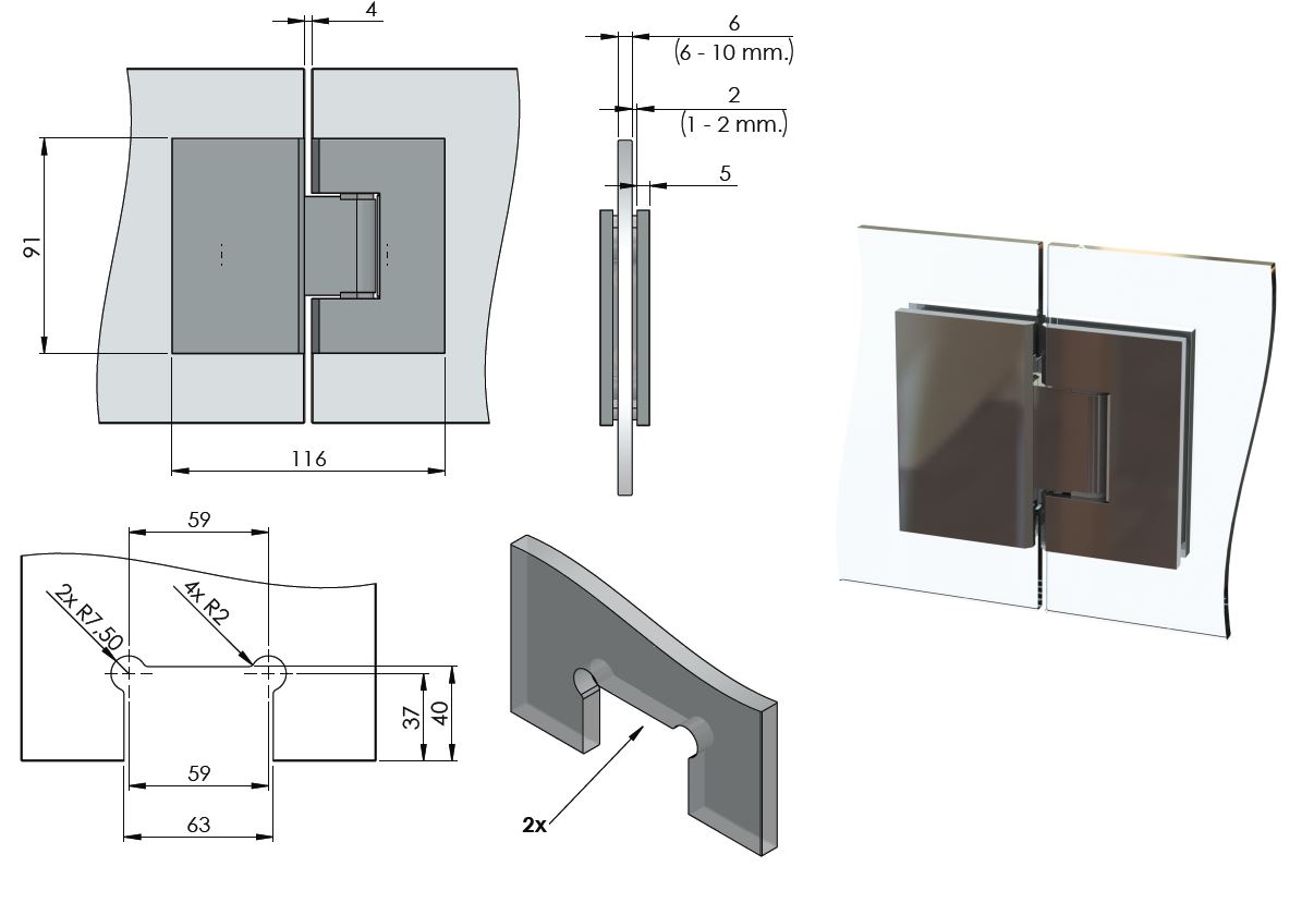 Shower Hinge "Tex III", 180DG, CPL, Glass/Glass, 6-10mm. Glass Thickness, W/15 DG Angle Adjustment Function & 25DG Return Function, Brass Material, Straight Edges. Incl. 4 x Transp. 1mm & 4 x Transp. Cushions 2mm Thickness