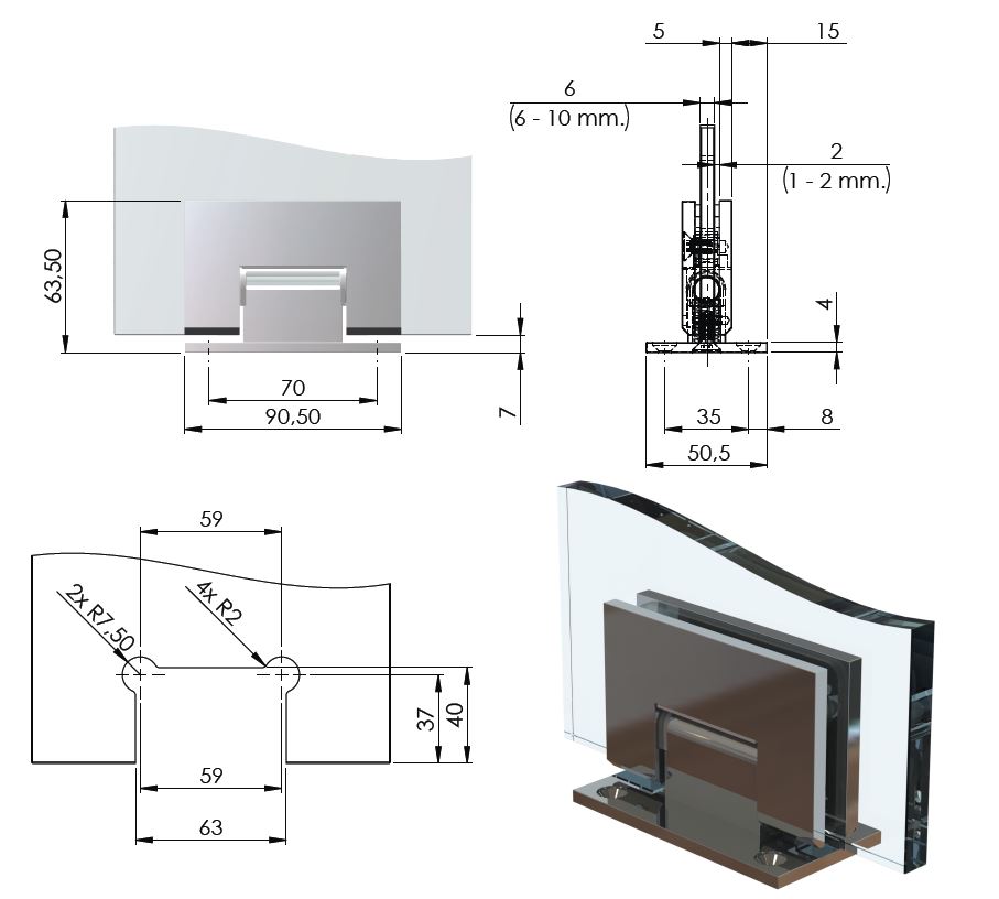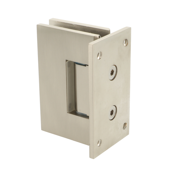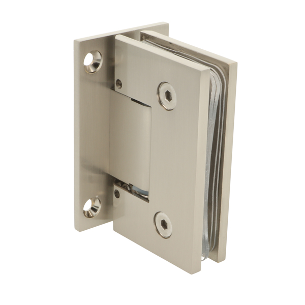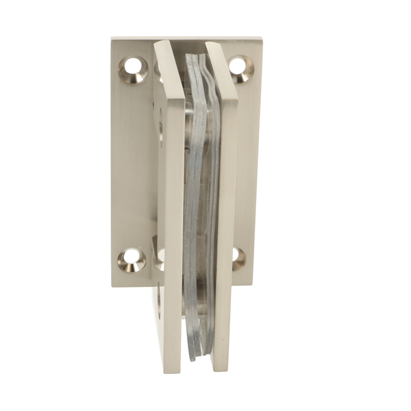 Shower Hinge "Tex III", Wall/Glass, SS-Look, Centre Back Pl, 6-10mm Glass Thickness, W/15 DG Angle Adjustment Function & 25DG Return Function, Brass Material, Straight Edges 2 x Transp. 1mm & 2 x Transp. Cushions 2mm Thickness