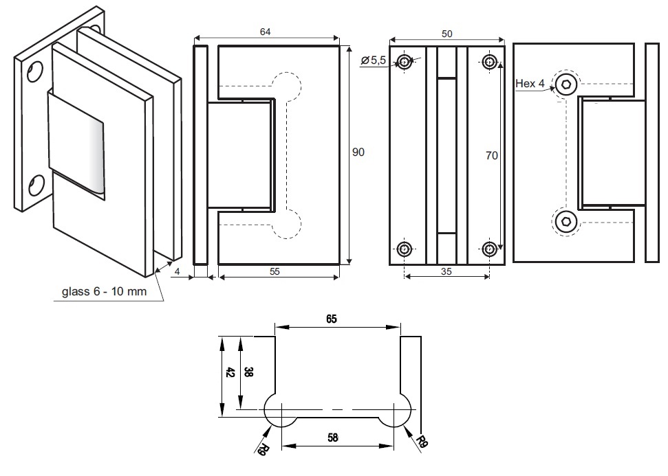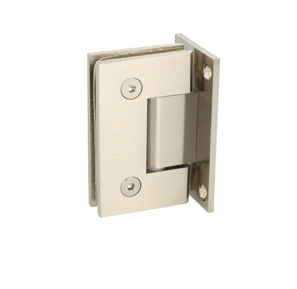 Shower Hinge "Tex", Wall/Glass, SS-Look,No Adjustment,Centre Back Plate, 6-10mm Glass, No Angle Adjustment Function But 25DG Return Function, Brass Material, Straight Edges